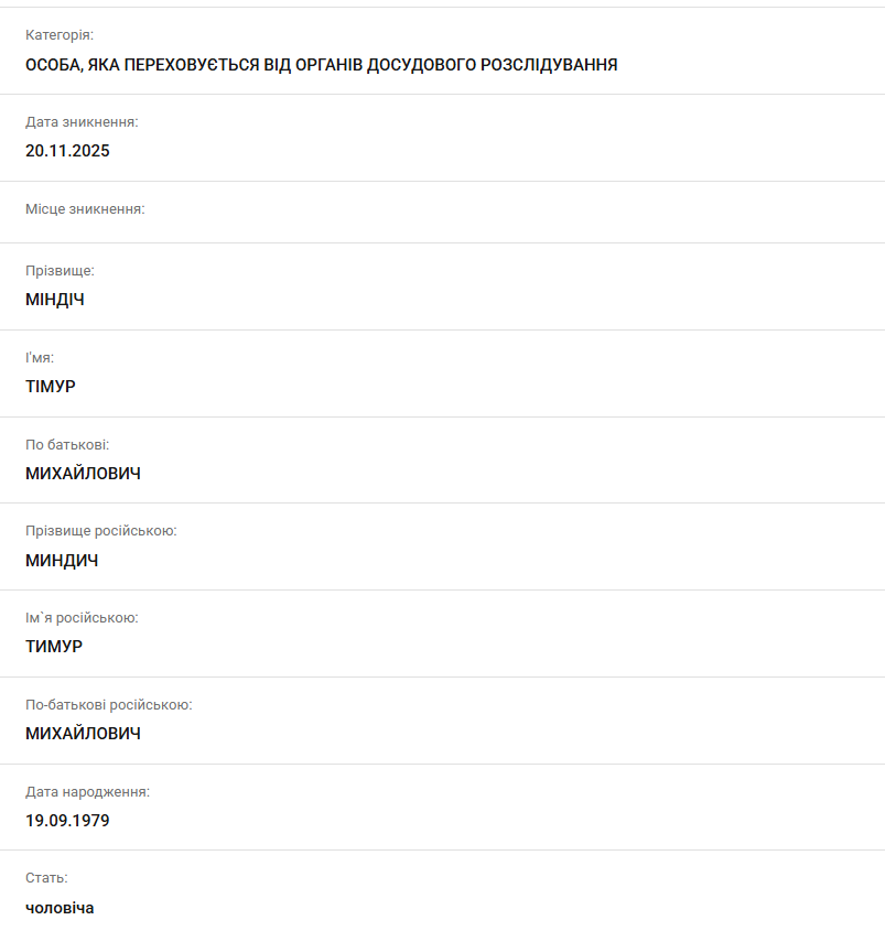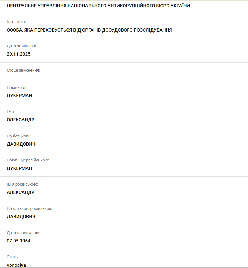 Датой исчезновения Миндича указано 10 ноября 2025 года, а Цукермана – 26 октября 2025 года. Сейчас продолжаются оперативные мероприятия по их розыску и установлению местонахождения.