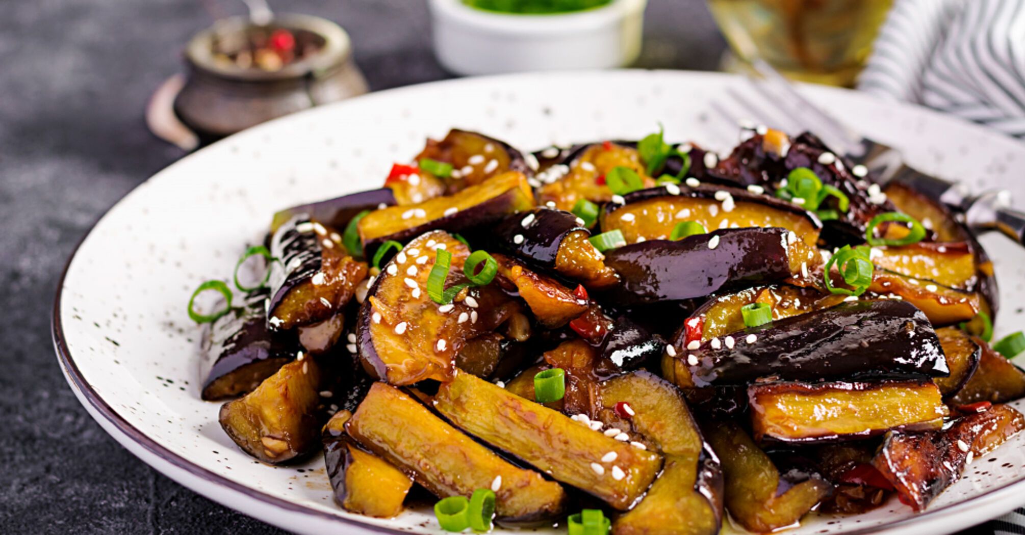 - Нарежьте баклажаны на кусочки. Сложите их в пакет-слайдер вместе с тахини, уксусом, кунжутным маслом и солью. Хорошо перемешайте, чтобы все ингредиенты равномерно распределились, одну сторону каждого сегмента оберните в кунжуте.
