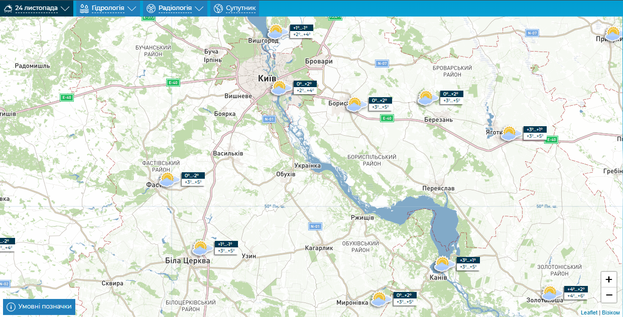 "Прогноз погоды на сутки 24 ноября по территории Киевской области. Облачно с прояснениями, днем без осадков. Температура по области днем 0-5°С тепла; в Киеве днем 2-4°С", – говорится в сообщении.