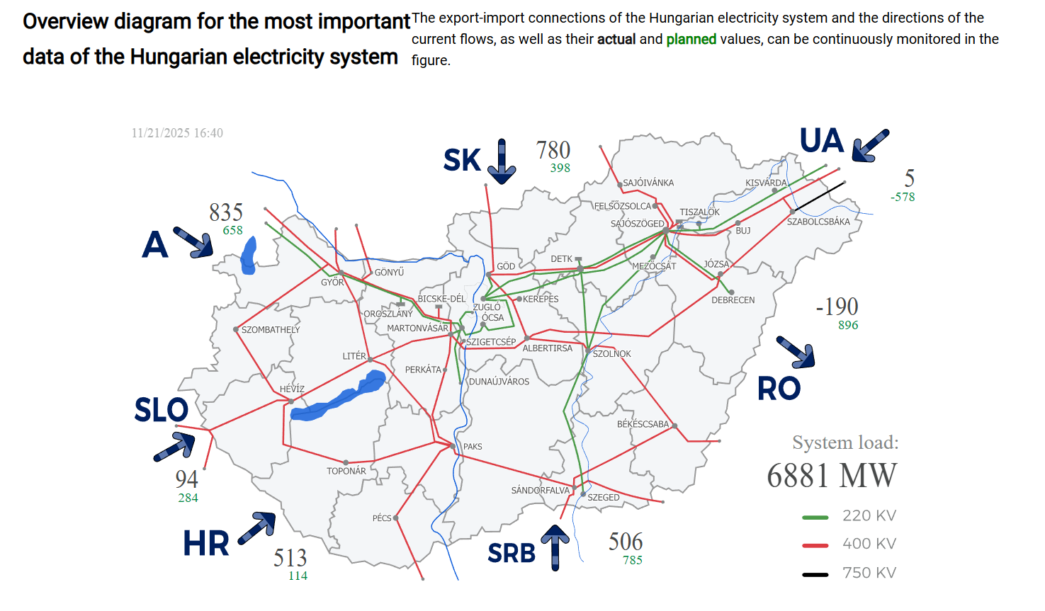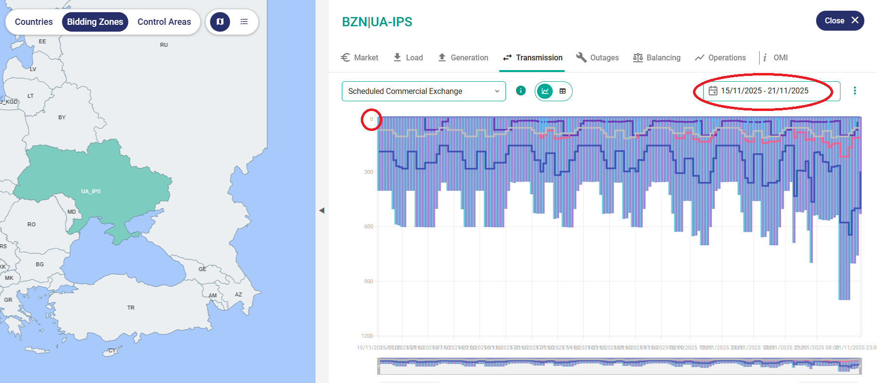 Это официальный ресурс европейской энергосистемы ENTSO-E, к которой с 2022 года присоединилась и украинская объединенная энергосистема (ОЭС). Чтобы увидеть, есть ли экспорт электроэнергии, по ссылке нужно выбрать Украину.