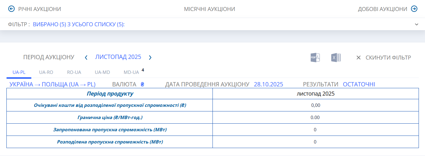 Там размещается информация о ежедневных межгосударственных аукционах по экспорту и импорту электроэнергии. Поэтому, можно посуточно отслеживать отсутствие поставок из Украины, например, в Словакию, Венгрию или Польшу.