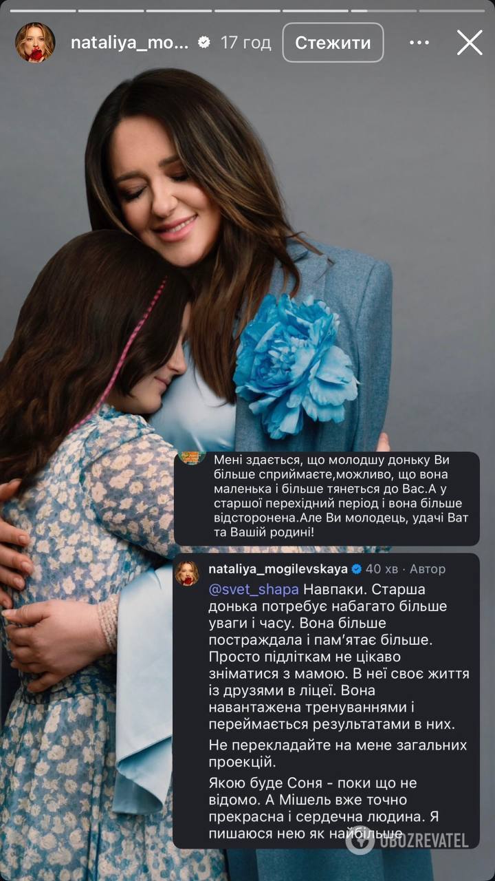 Під публікацією Наталії Могилевської з'явився коментар: "Мені здається, що молодшу доньку ви більше сприймаєте. Можливо, вона маленька і більше тягнеться до вас. У старшої перехідний період і вона більше відсторонена. Але ви молодець, удачі вам та вашій родині!"