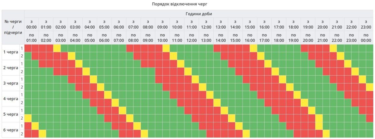 Графіки погодинних відключень (ГПВ) для побутових споживачів запроваджено з 00:00 до 23:59 – обсягом від 1 до 2,5 черг.