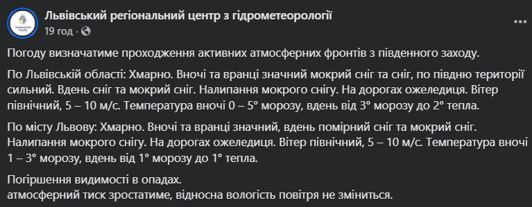 Можливе налипання мокрого снігу, на дорогах – ожеледиця. Вітер північний, 5–10 м/с. Температура повітря вночі становитиме від 0 до -5 градусів, удень від -3 до +2 градусів.